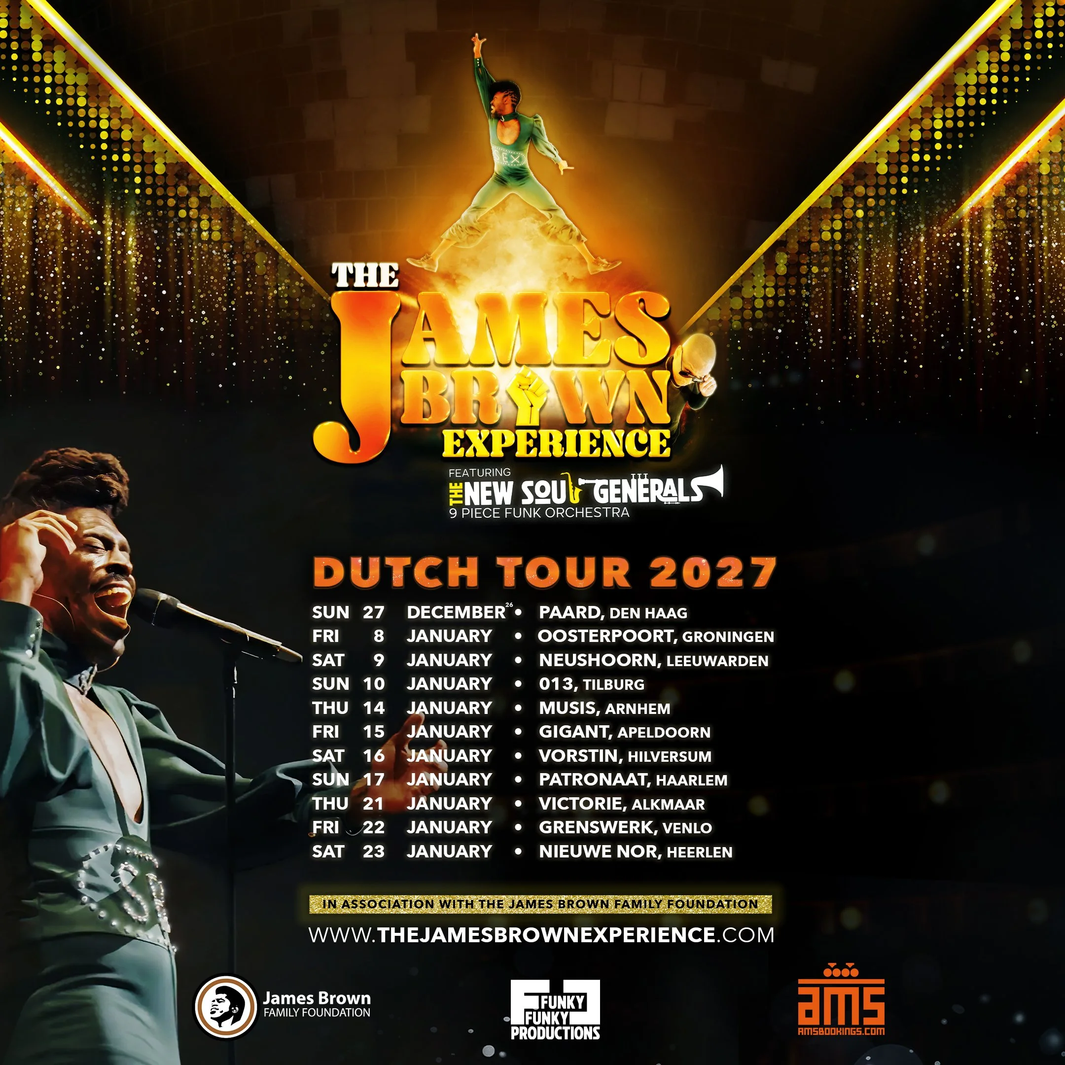 Sun 27 Dec 2026 — Den Haag, NL Paard Find Tickets Fri 8 Jan 2027 — Groningen, NL Oosterpoort Find Tickets Sat 9 Jan 2027 — Leeuwarden, NL Neushoorn Find Tickets Sun 10 Jan 2027 — Tilburg, NL 013 Find Tickets Thu 14 Jan 2027 — Arnhem, NL Musis Find Tickets Fri 15 Jan 2027 — Apeldoorn, NL Gigant Find Tickets Sat 16 Jan 2027 — Hilversum, NL Vorstin Find Tickets Sun 17 Jan 2027 — Haarlem, NL Patronaat Find Tickets Thu 21 Jan 2027 — Alkmaar, NL Victorie Find Tickets Fri 22 Jan 2027 — Venlo, NL Grenswerk Find Tickets Sat 23 Jan 2027 — Heerlen, NL Nieuwe Nor Find Tickets